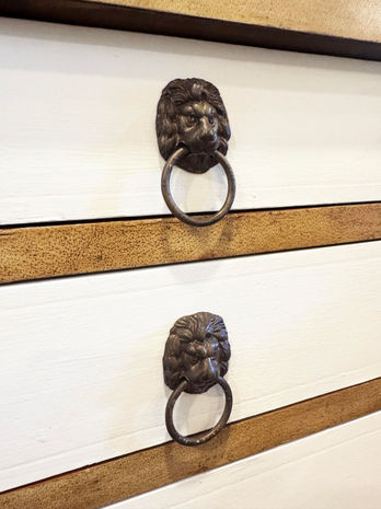 This impressive pair of statement chests blends classic design elements with a chic modern edge. The silhouette, clean lined & reminiscent of neoclassical and empire-inspired design is enhanced by the newly refinished custom matte paint and light wax glaze finish applied to the sleek drawers for THE TASTEMAKER SHOPPE. A matte, soft, black wax finish was applied to the brass bust & feet to contrast & enhance their charming details. A striking contrast between the original (intentionally) worn in leather wrapped frame and its newly sleek, ivory waxed drawer fronts creates a versatile aesthetic that complements a variety of interiors. The stylish bust & sandaled feet accents add an artistic and sculptural element to the design. The ring pull hardware in an antiqued metal finish further elevates the sophisticated, yet casual appeal. Resting on carved, fluted feet, these chests exude a refined presence with great storage and personal style. This one-of-a-kind pair is a very rare find—ideal for those who appreciate timeless design with a modern vibe. Made by Kreiss, an American luxury home furnishings brand and interior design firm legendary for pioneering and defining the "California look," also referred to as the "Kreiss look". This style emphasizes comfortable, casual elegance with a timeless, resort-like feel.