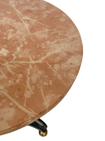 A favorite pair of drink tables! Great side (or drink) tables topped with polished Rojo Alicante marble, sourced from quarries located in the Alicante province of eastern Spain. This warm, rich red marble has earthy terracotta-peachy hues with soft, white, French grey veining. It blends in miraculously with Spanish interiors, especially those with terracotta or Saltillo tile floors, which can be tricky to blend in with. Sturdy, black iron bases provide a masculine contrast to the warm marble, while brass feet & accents infuse a layer of luxury and refinement. With classical European charm, they most likely originated in France or Italy. Despite bearing minor chips on the marble tops, these imperfections do not detract from the tables' overall aesthetic appeal or their structural integrity. Instead, they possess a sense of antiquity and character. Its Parisian charm pulls you in, the more you look, the more there is to love and appreciate. As a Curator and Interior Designer, these are the timeless qualities I seek – knowing it will transcend time, always in style, never trendy. A treasured find for collectors and enthusiasts of unique and one-of-a-kind pieces.