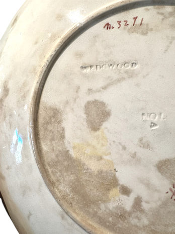 Wedgwood Majolica Chrysanthemum Dessert Ware with a storied heritage and provenance, owned by Legendary Fashion Icon André Leon Talley! On plate reverse is marked with pattern# M3271 and impressed with “NOL” indicating the production date of 1883. The Chrysanthemum pattern was introduced around 1882 and Wedgwood created approximately 44 styles/entries. This plate was created in the Argenta style which refers to a softer color palette on an ivory ground and was popularized by Wedgwood in the 1870s. It was a shift from the typically bright hues of Victorian ceramic wares and was a response to the ever changing tastes of the time where the deeper colors of earlier Majolica were starting to fall out of style.
